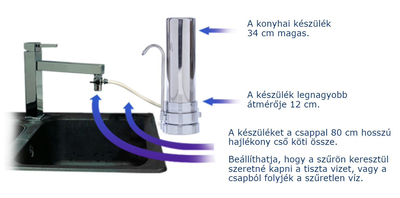 • A vízszűrő készülék helyigénye kicsi, a konyhapulton a mosogató mellett kis helyet foglal. Nem kell a konyhát átépíteni hozzá.